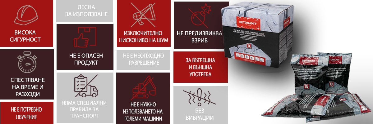 BETONAMIT® 20 кг - Не се изискват специални умения или оборудване за работа. - Лесно и прецизно разрушаване на скали и бетон без необходимост от...